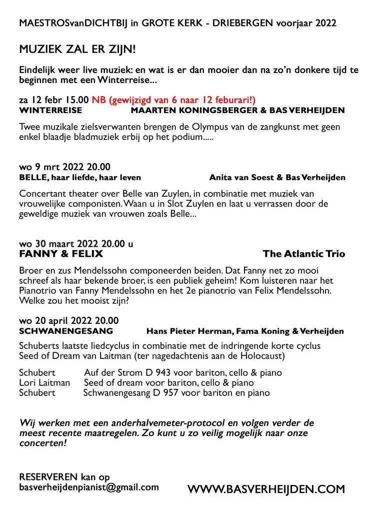 Reserveren concerten MAESTROSvanDICHTBIJ basverheijdenpianist@gmail.com